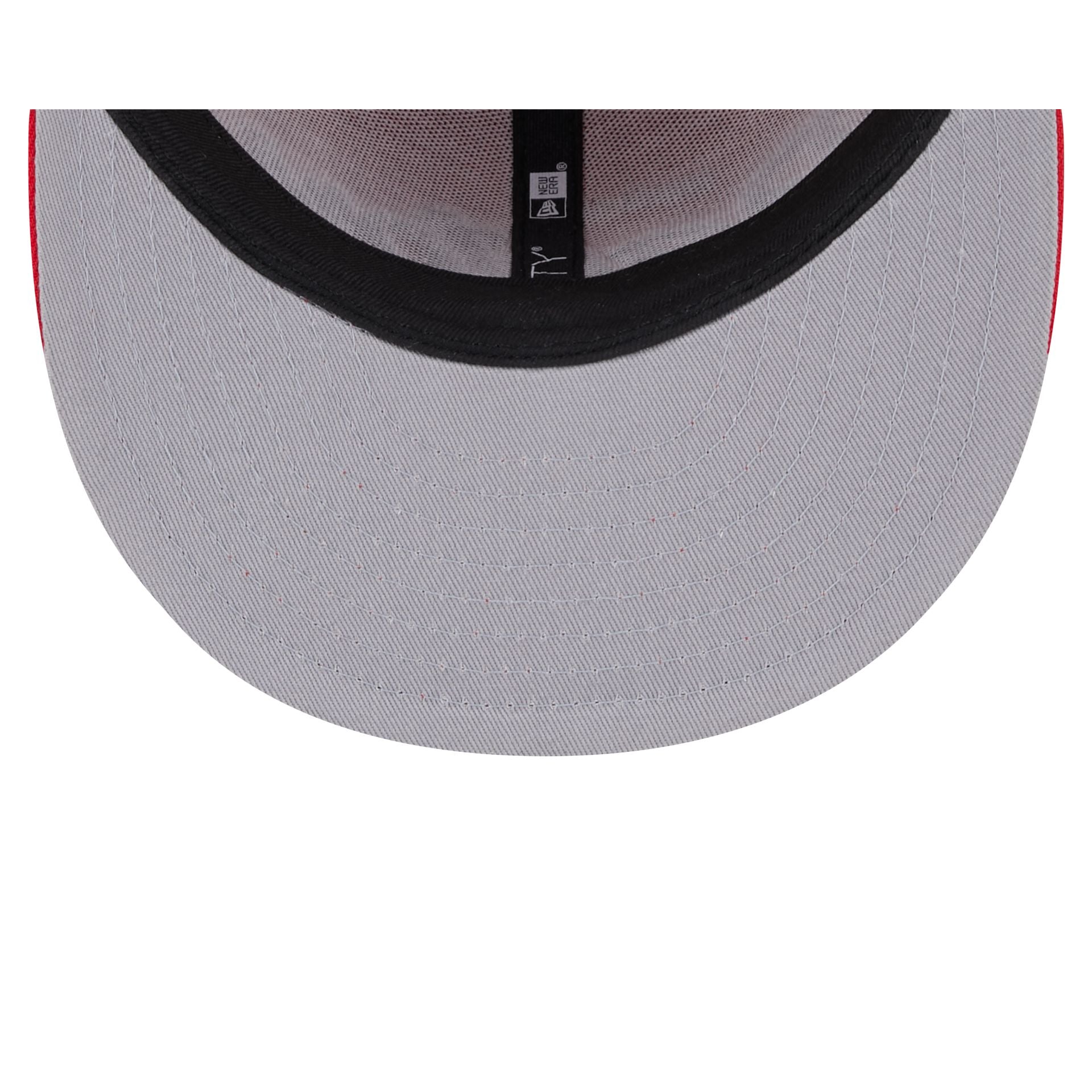 The Toronto Raptors Kids 9FIFTY Snapback Hat features an embroidered Raptors wordmark at the front panels with a matching team logo at the right-wear side. Additional details include a gray undervisor and a snapback closure at the rear.