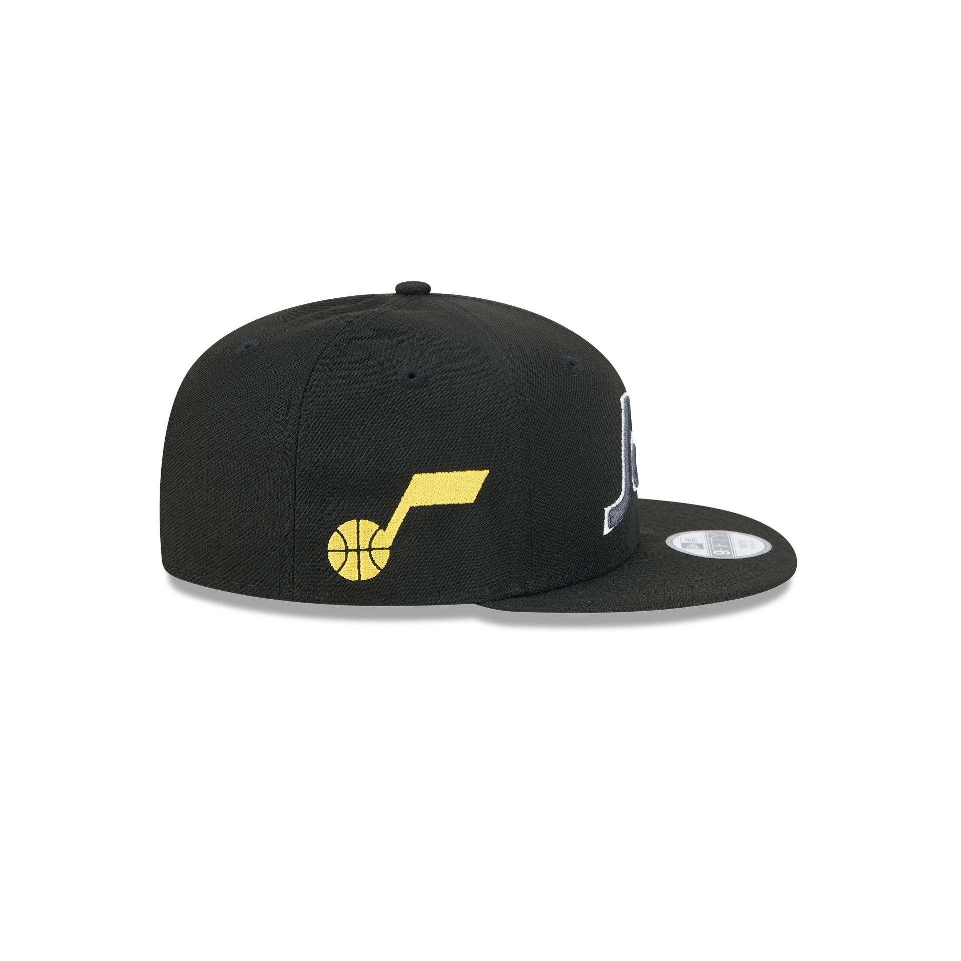 The Utah Jazz Kids 9FIFTY Snapback Hat features an embroidered Jazz wordmark at the front panels with a matching team logo at the right-wear side. Additional details include a gray undervisor and a snapback closure at the rear.